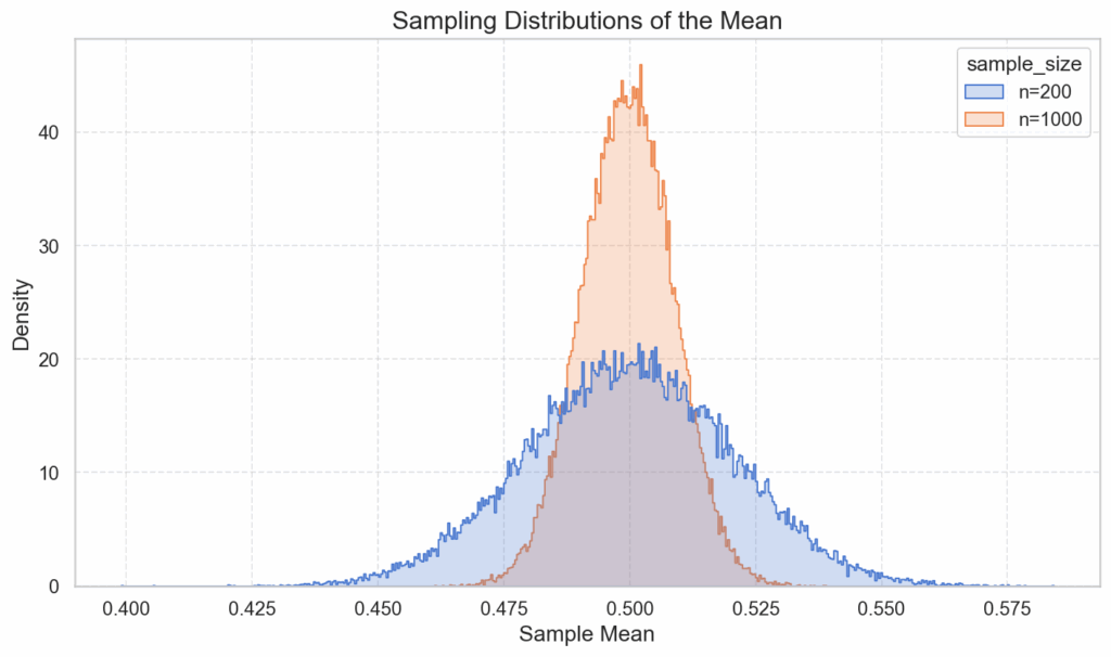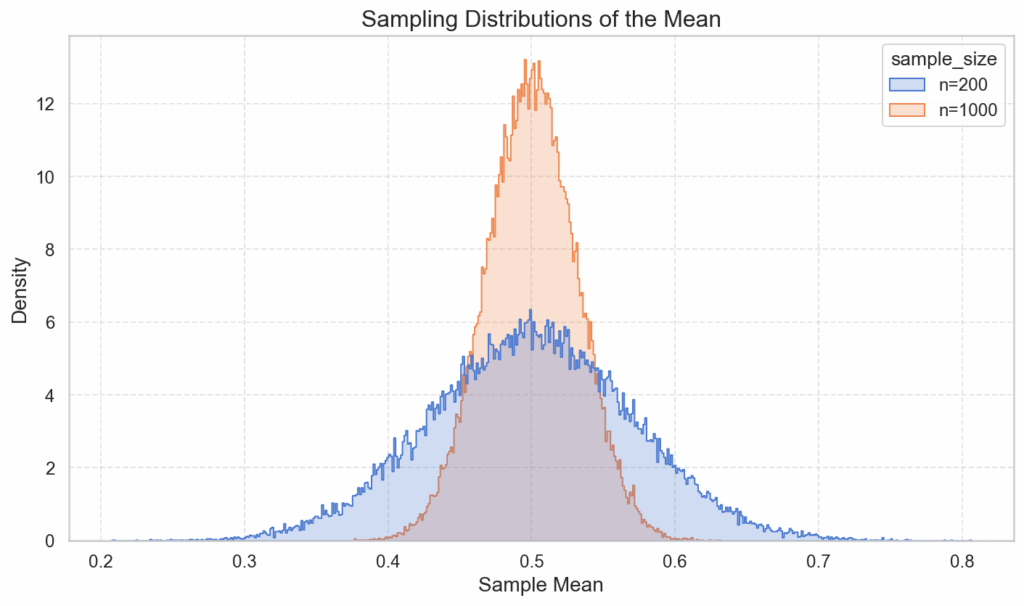 And finally, we plot the “sampling distribution of the mean”, based on 50.000 drawings of samples of size 200 and of size 1000. For each sample, we calculate the mean individually, and count how many times a mean falls into its respective bin, so that we can again plot those occurrences as frequency plots. (In order to get a better comparability between the two curves we use the density plot variant)