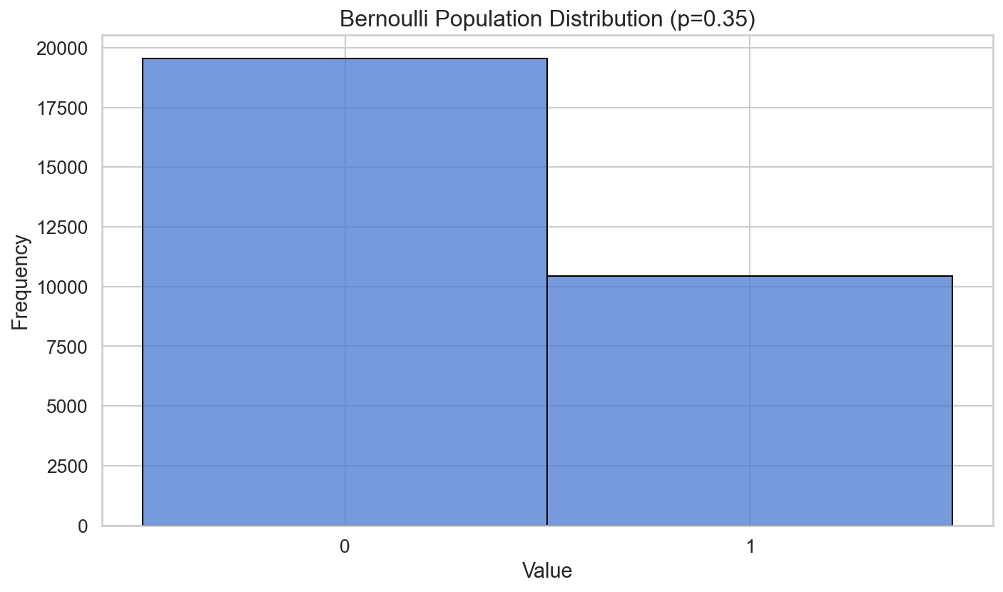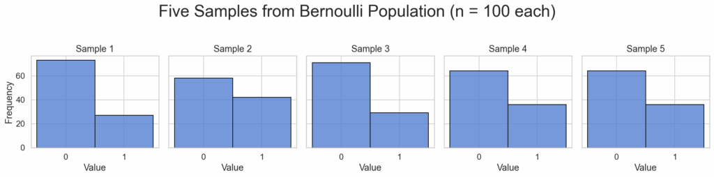 The same works for Bernoulli distributions as well, which only considers proportions of two categories within a population. E.g., whether something is true or false of an individual. Whereas the distribution plot for the population and for the individual samples only consists of two bars, the sampling distribution again increasingly resembles the normal distribution as we increase the sample sizes: