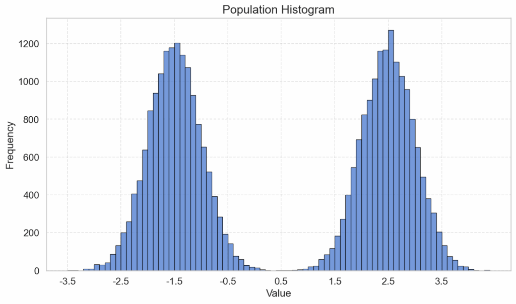The same pattern emerges for another example with a bimodal distribution, which has been created by having two normal distributions overlap. The two modes are at -1.5 and at 2.5. The population size is 15.000, the sizes of the 5 individual samples plotted are 200, and the data for the plot of the sampling distributions of the mean are the same as in the example before (50.000 drawings of samples of size 200 and 1000):