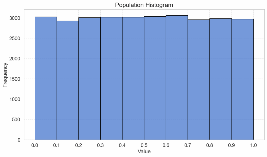 Shown below are the frequencies of values for a population of 30.000 instances of continuous, uniformly distributed numbers from the range of 0 to 1. In order to get frequency plots (histograms), we need to bin those numbers, and for this we use equal bin widths, which gives us the following interval data: