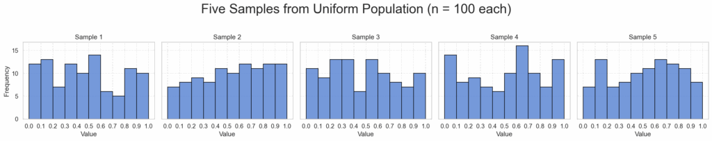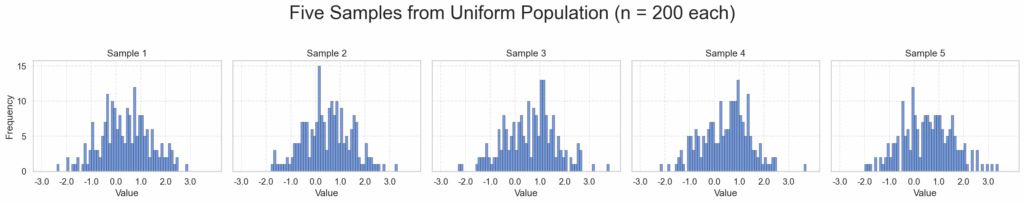 The interesting piece to note is that, while the individual samples’ histograms roughly resemble the uniform distribution of the population, this does not hold true for the sampling distribution of the means taken from the individual samples. This distribution approximates a normal distribution, with a standard deviation that shrinks with the square root.